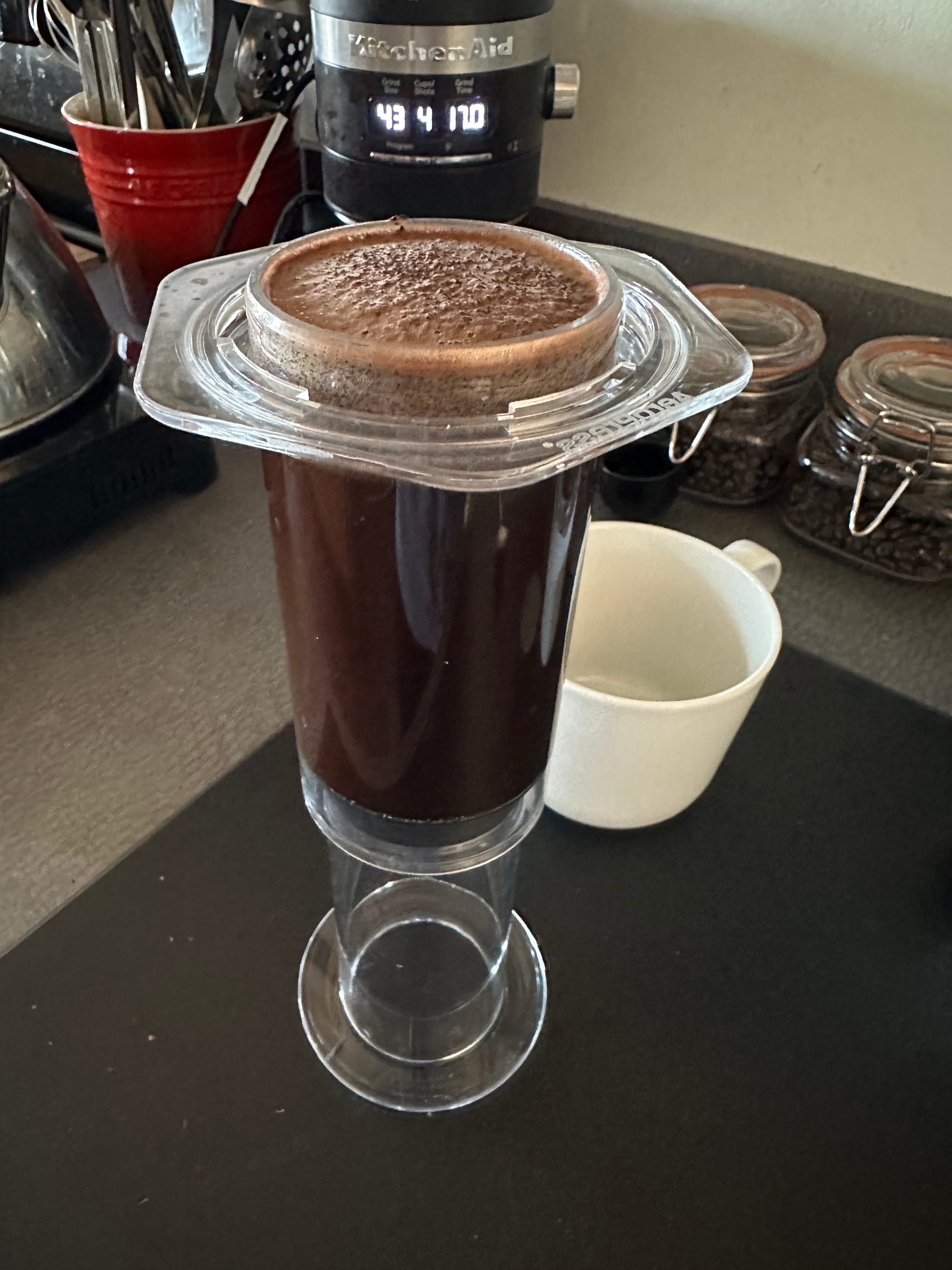 We brew the coffee using an Aeropress, we’ve done it that way for over 30 years. Trivia: The Aeropress is from the makers of the Aerobee, a Frisbee-like device that used to be popular but got stuck in trees really easily.