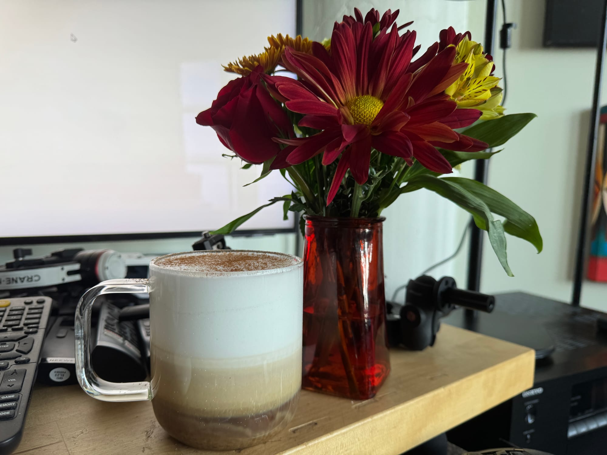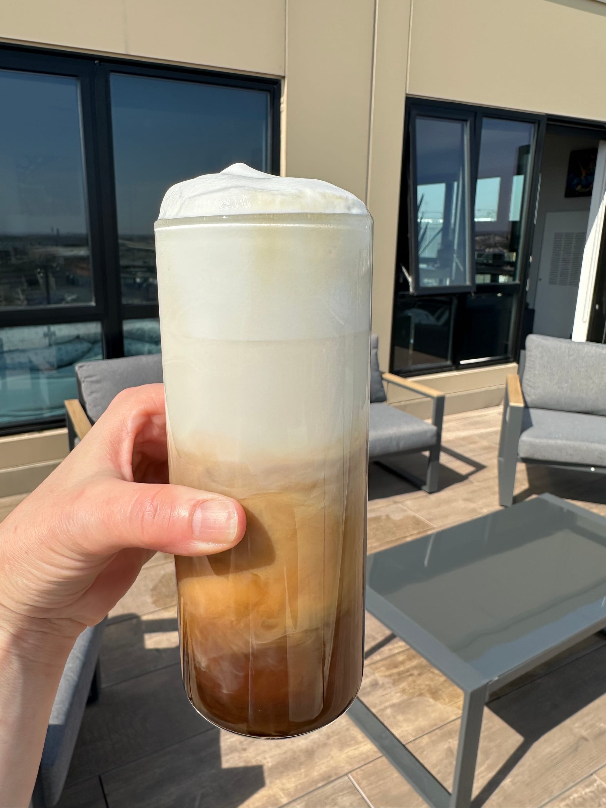 The foam and milk for the drink come from an Instant Pot frother. It does hot and cold froth. It’s a bit of a miraculous device, the cappuccinos I get from the Aeropress and the frother are totally legit.